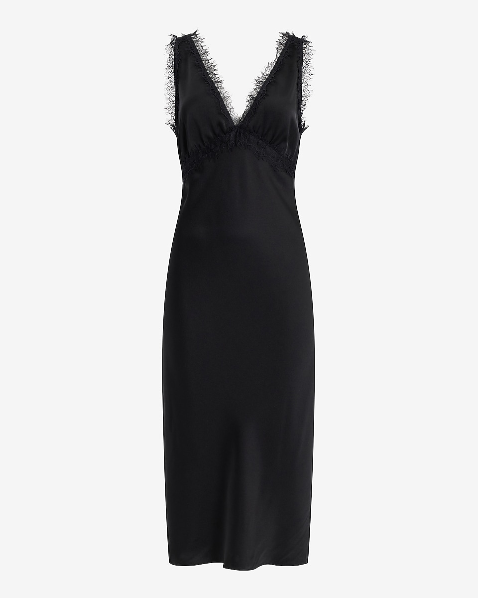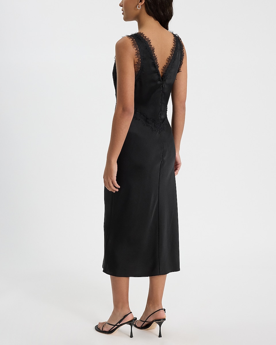 Lace Trim Satin V-Neck Sleeveless Midi Slip Dress 55182461