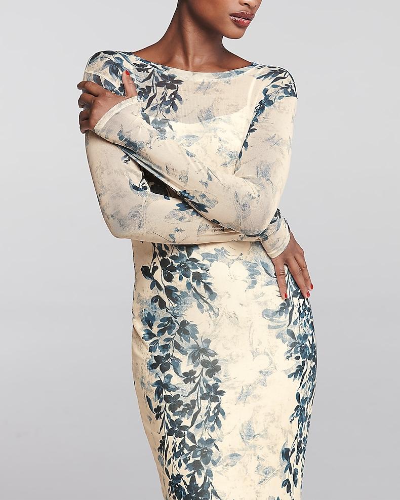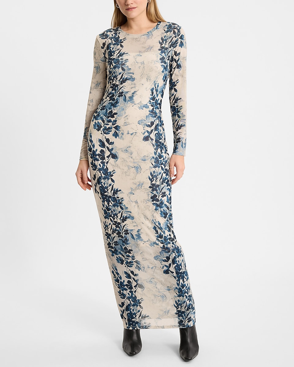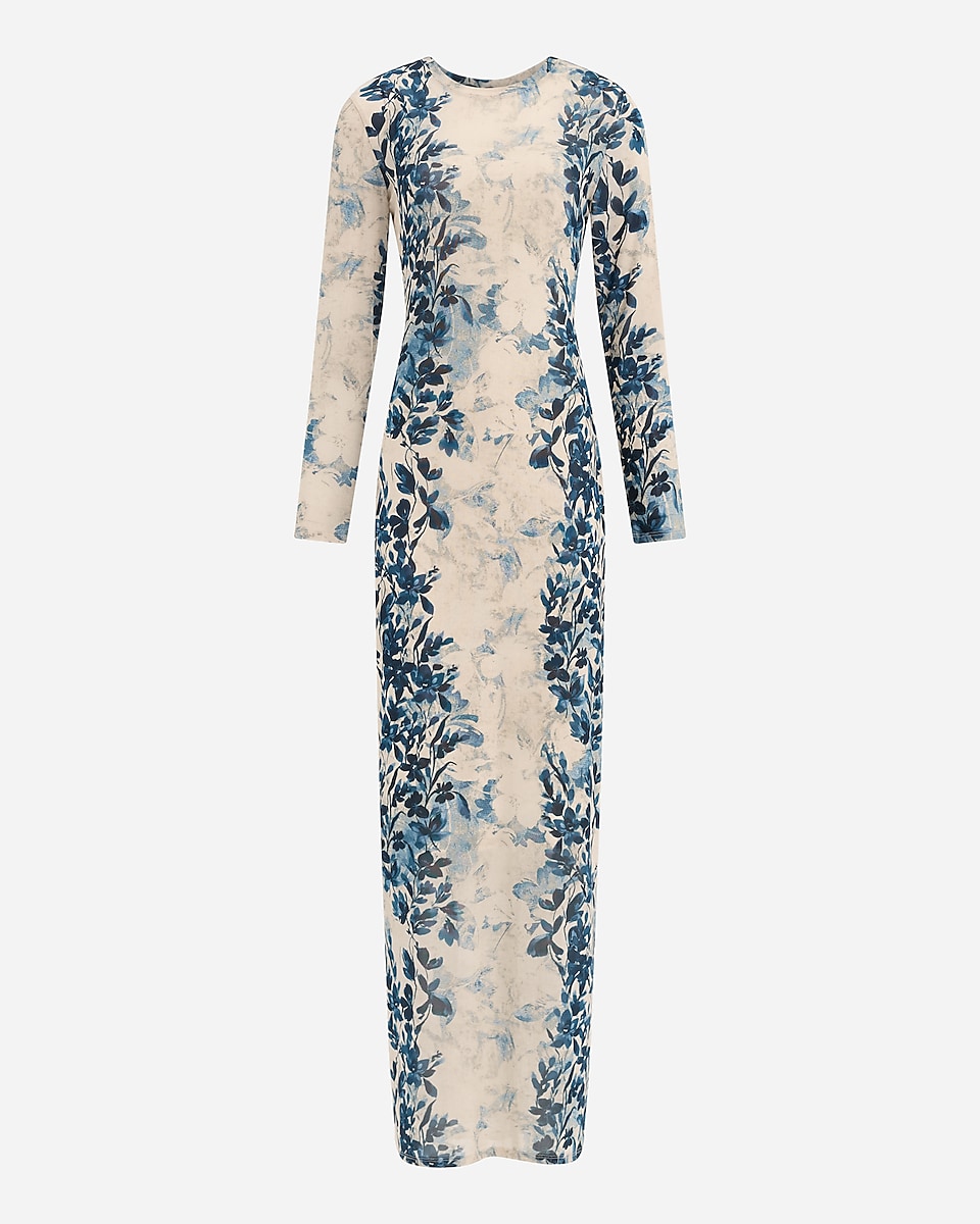 Printed Mesh Crew Neck Long Sleeve Maxi Dress 55182451