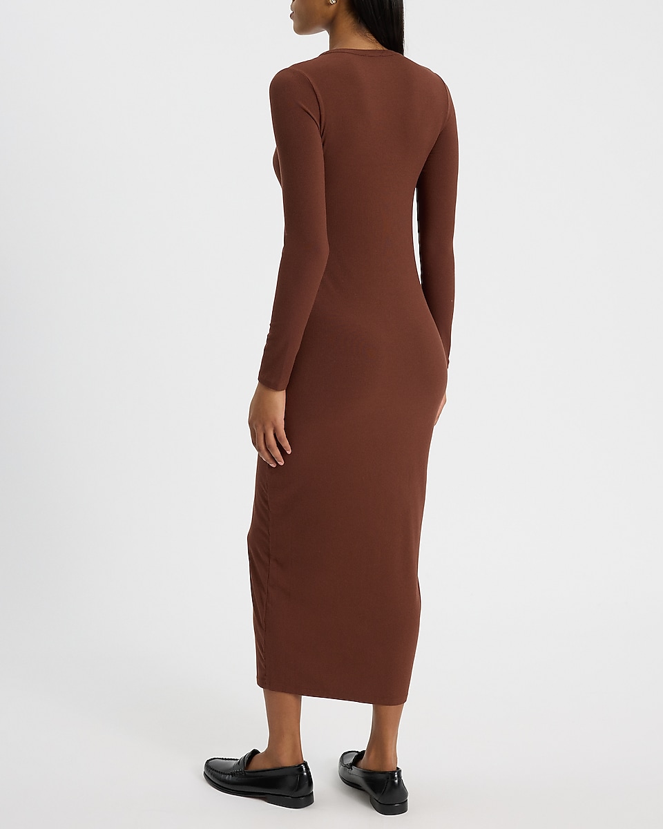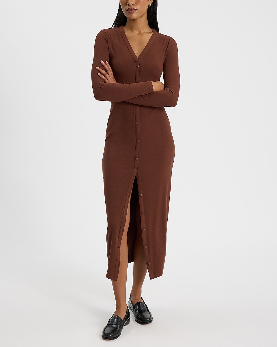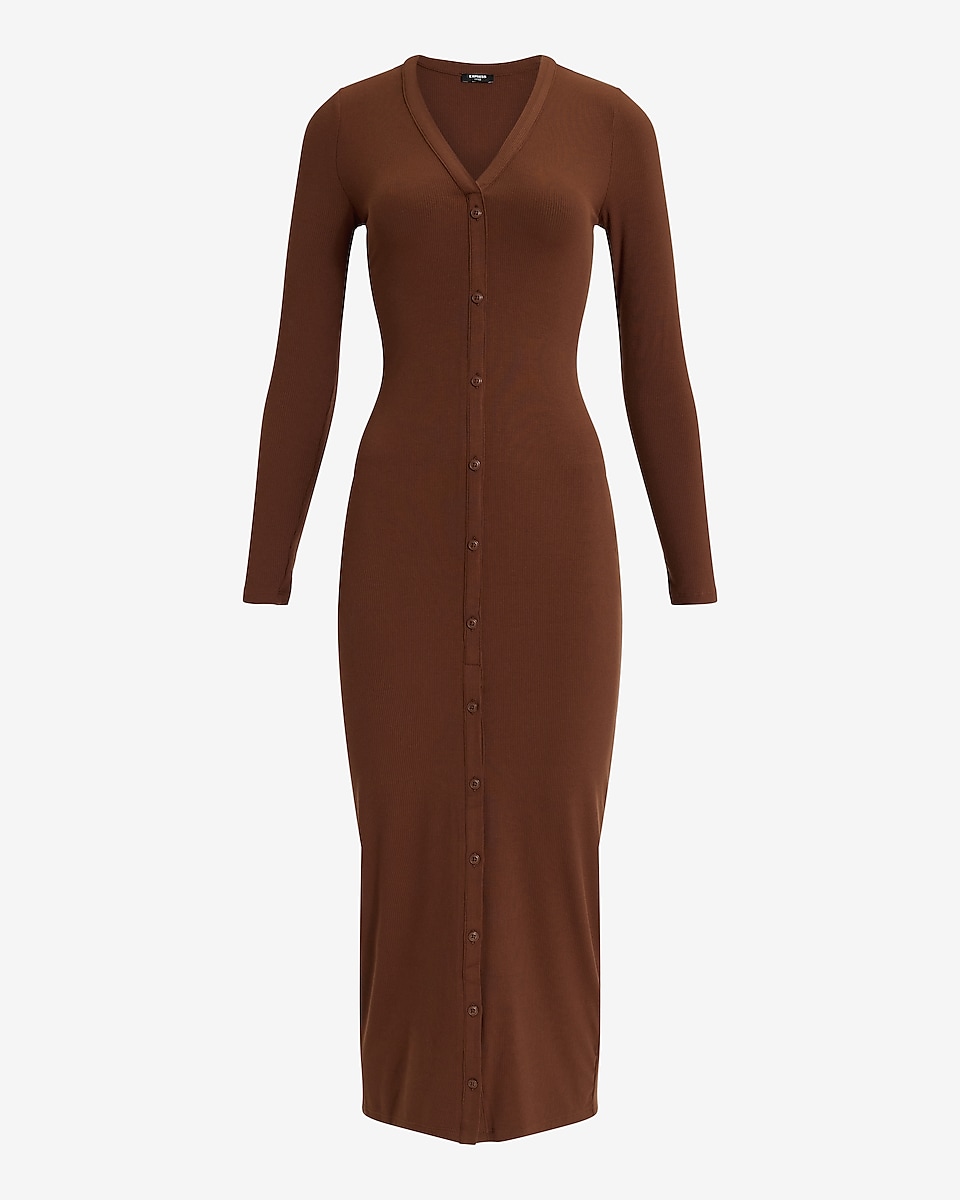 Ribbed Knit Long Sleeve Button Down Midi Dress 55182501