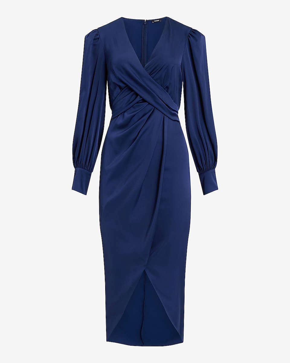 Satin Long Sleeve Surplice Midi Dress 55182471